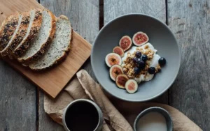 Served healthy breakfast on wooden table